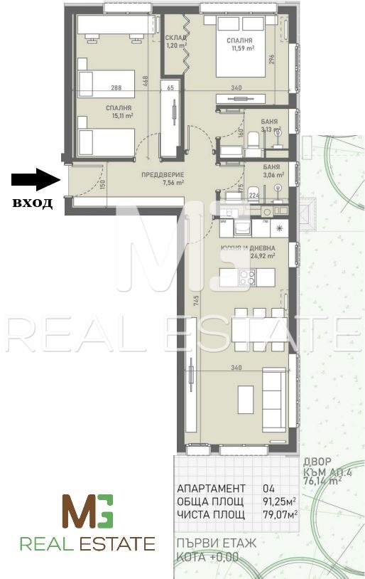 Квадратура: 91,25; Чиста жилищна площ: 79,07; Общи части: 12,18; Към апартамента има принадлежащо дворно пространство от 76,14 кв.м.;