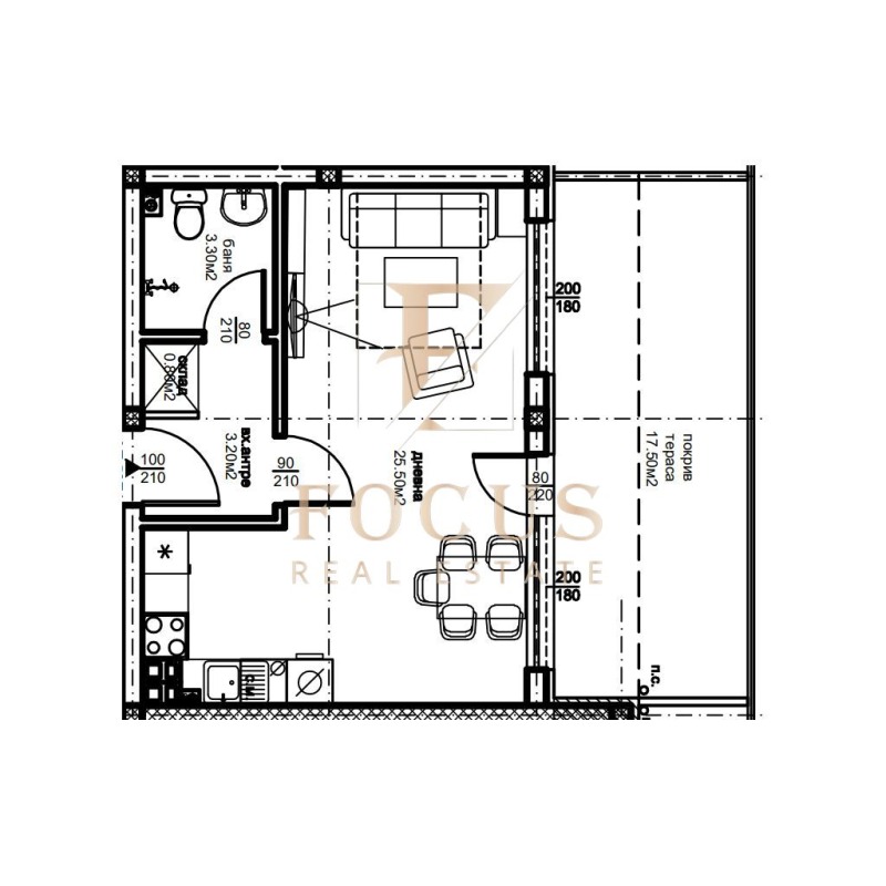 Апартаментът е с обща площ от 110,45 кв.м. със следното разпределение: антре, дневна с кухненски бокс, две спални, баня с тоалетна, отделна тоалетна, склад и дворна веранда - 17,50 кв.м.