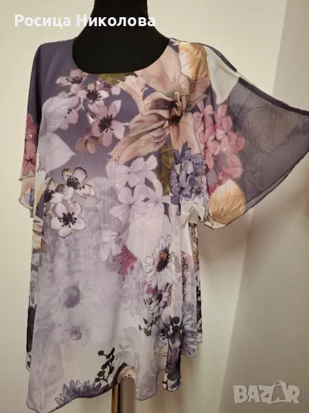 Блуза от шифон с подплата и размери-дълж 78см, гр об 126см, ханш до 160см, вискоза и еластан. Туниката е бълг произв.