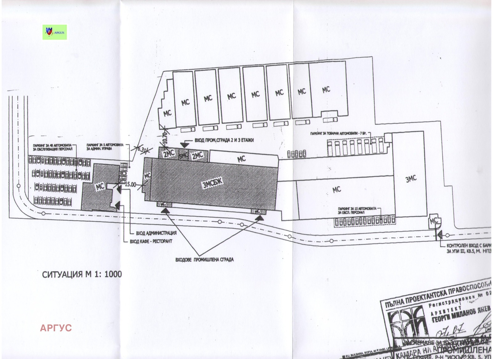 Агенция АРГУС продава 1-ви надпартерен етаж със застроена площ от 1944 м2 и 2-ри надпартерен етаж със застроена площ 2510 м2 от МАСИВНА 4-етажна СКЛАДОВО ПРОИЗВОДСТВЕНА СГРАДА + трафопост с мощност 1200 Kw, както и 33.46 % ид. части от УПИ, върху който е построена сградата с площ 3745 м2 и същия % ид. части от ПИ урбанизирана територия за второстепенна улица с площ 2369 м2. Добра локация, отлична инфраструктура, TIR достъп, всеки от етажите е захранен с 3 фазен ток, вода, до имота има газ. От двата края на сградата има товарни рампи и респективно два товарни асансьора с товароподемност до 1 т. и габарити 2м/2м/2м. Приблизително разпределение на всеки от етажите : основен коридор, около който в ляво и дясно има около 10 помещения с площ от 150 м2 и 200 м2. В двата диаметрални края на етажа са разположени стълбищните клетки с товарните асансьорите, сервизните помещения и офиси. Височина на помещенията е 3.80 м. Етажите са СЛЕД РЕМОНТ, нова ПВЦ дограма, под - шлайфан бетон.