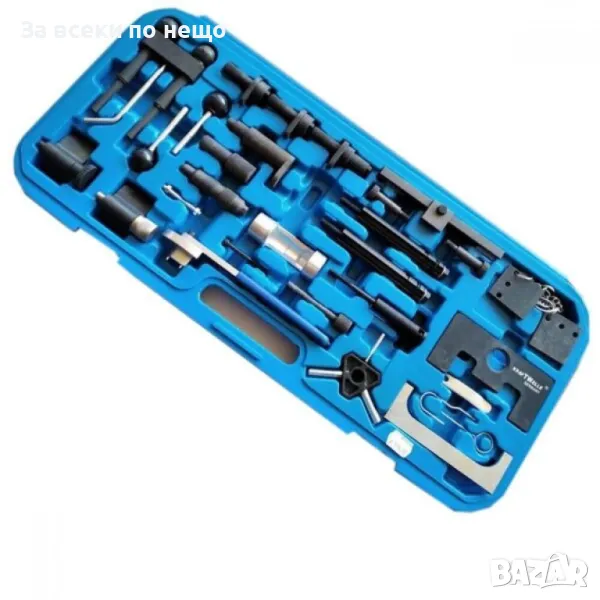 В удобен пластмасов куфар са подредени различни инструменти за застопоряване на колянови валове, разпределителни валове, инжекционни помпи, ключ за обтяжна ролка, ключ за ламбда сонда и други.