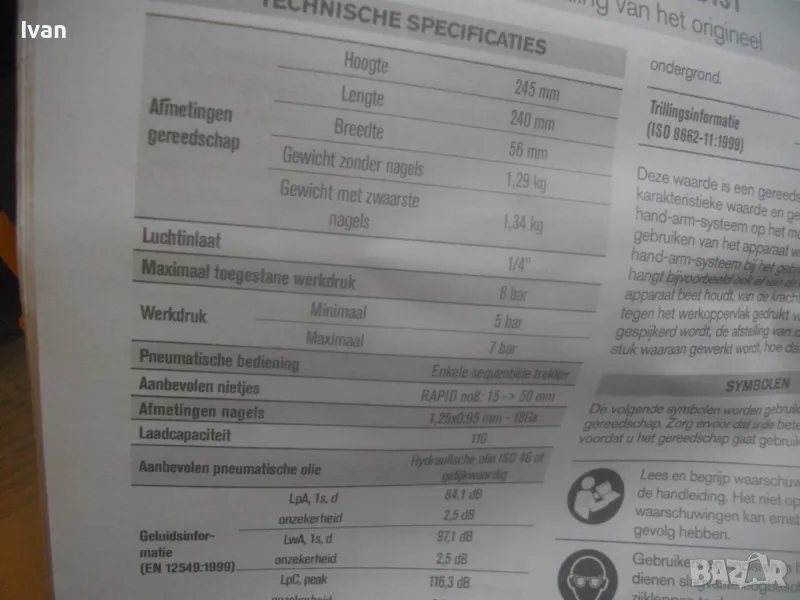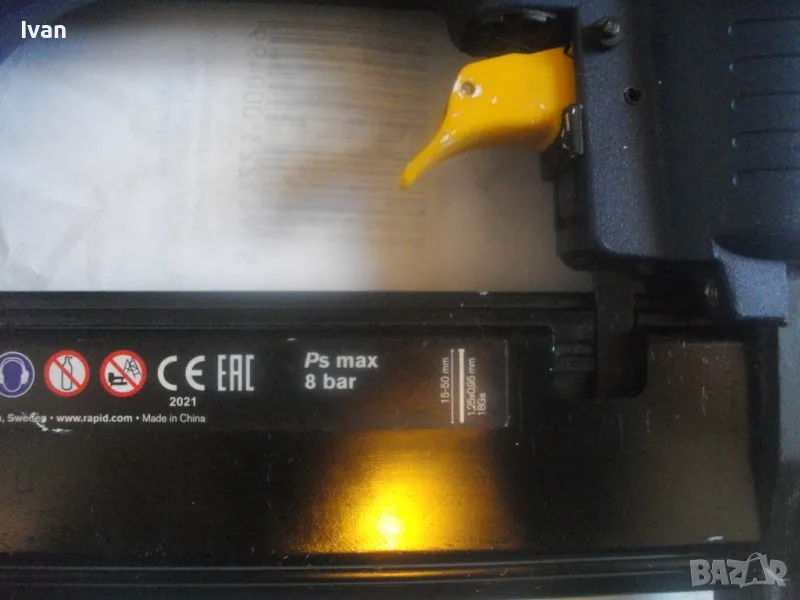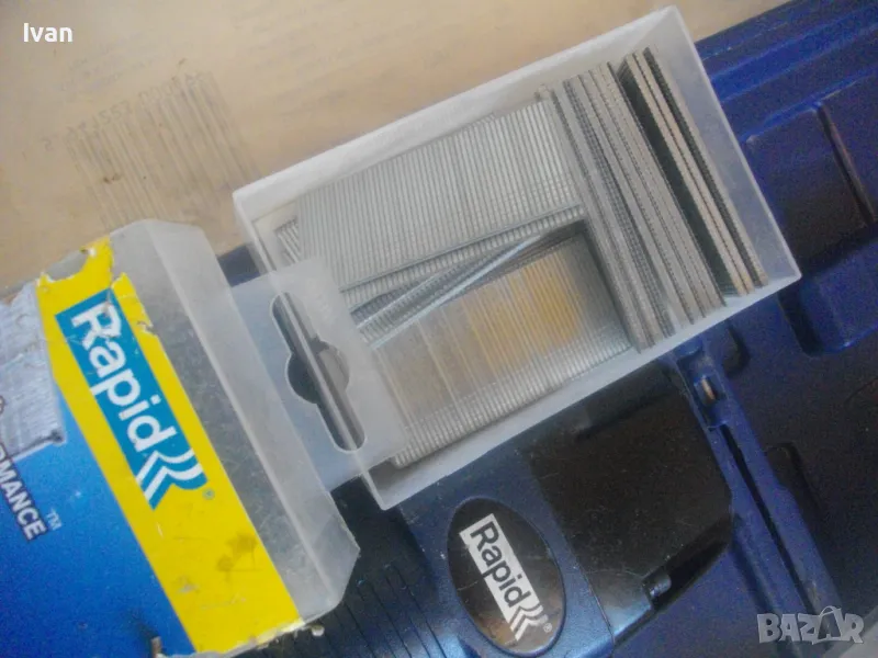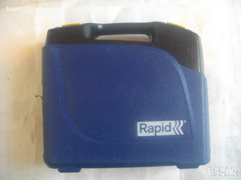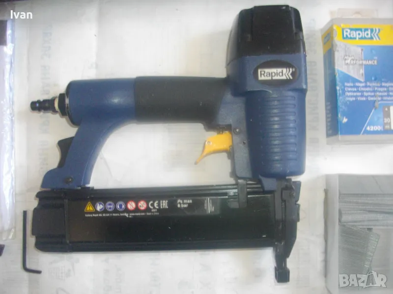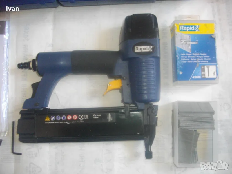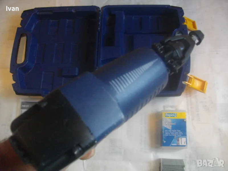 такер за пирони 15-50 мм дължина, масивен модел на Рапид. Марка и модел на такера RAPID PB131. Машината е почти нова, много малко ползвана, в отлично работно, техническо и визуално състояние. От оригиналното шведско производство 2021 г. - Made in SWEDEN. Производител HESTRA SWEDEN. Пълен комплект - машина, куфар, техническа документация, кутия с пирони, ключ и резервна гумичка за главата да не се наранява повърхността на кования материал при удара на машината. Размери на такера 245 х 240 х 50 мм, тегло 1,30 кг, извод за бърза връзка отзад - размер 1/4, максимално налягане на компресор - 8 bar, препоръчително налягане при работа 5-7 bar. Такера е за консумативи само пирони размери 15-50 мм дължина. Тип и размер на пироните 1,25 х 0,95 - тип 18GA. Голям пълнител за 110 броя консумативи. Поставен щуцер оригинален бърза връзка на такера за скачване с маркуч на компреор. Функция бързо отваряне на главата за премахване на заседнал консуматив. Гумирана повърхност на дръжката. Регулация сила на удар. Ключ шестограм шестостен оригинален, резервна гумичка за оста отпред на такера, масивен метален корпус на машината. Към такера има 1 кутия почти пълна с оригинални пирони шведски на Рапид от типа 18GA с дължина 30 мм, от който са останали около 25-30 блистера. Налична е техническата документация на машината. Наличен е оригиналния куфар на машината в пълна изправност с изправни копчалки. Размер на куфара 315 х 315 х 105 мм. Тегло на комплекта - 3,8 кг. .
