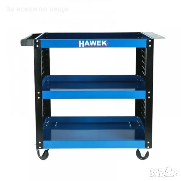 Подвижна и удобна сервизна количка с 3 рафта за съхранение и транспорт на всякакви инструменти. Снабдена с допълнителна поставка за отвертки. Изработена е от висококачествени материали, здрава и лесна за придвижване благодарение на 4 колела и удобна дръжка. Много подходяща за сервизи и работилници. HAWEK е полска компания, която предлага широка гама висококачествени инструменти, спечелила доверието на огромен брой механици.