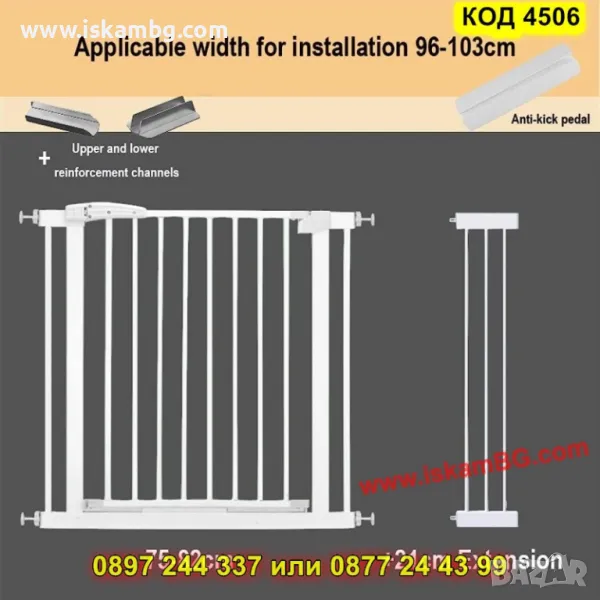 Регулируема ширина: Метална преграда с основен размер от 75 до 82 см и допълнително удължение от 21 см, общо до 103 см.