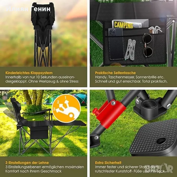 Този шезлонг има няколко практични опции за съхранение, включително страничен джоб за мобилен телефон, слънчеви очила или джобно ножче и вградена поставка за чаша. Удобният държач за бутилки гарантира, че вашите напитки са винаги наблизо. Тези допълнителни характеристики правят къмпинг шезлонга KESSER особено полезен и функционален за дълги дни на открито.