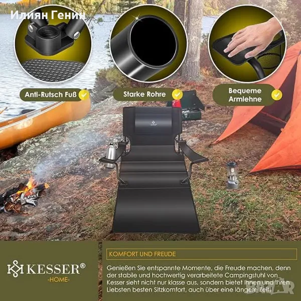 ЛЕСНО СГЪВАНЕ: Къмпинг шезлонгът KESSER е оборудван с интелигентна система за сгъване, която позволява бързо сглобяване и разглобяване без инструменти. Шезлонгът е готов за употреба или може да бъде прибран отново само за 10 секунди. С включената чанта за носене, компактният шезлонг може лесно да се транспортира, което го прави идеален спътник за всяко пътуване или дейност на открито.