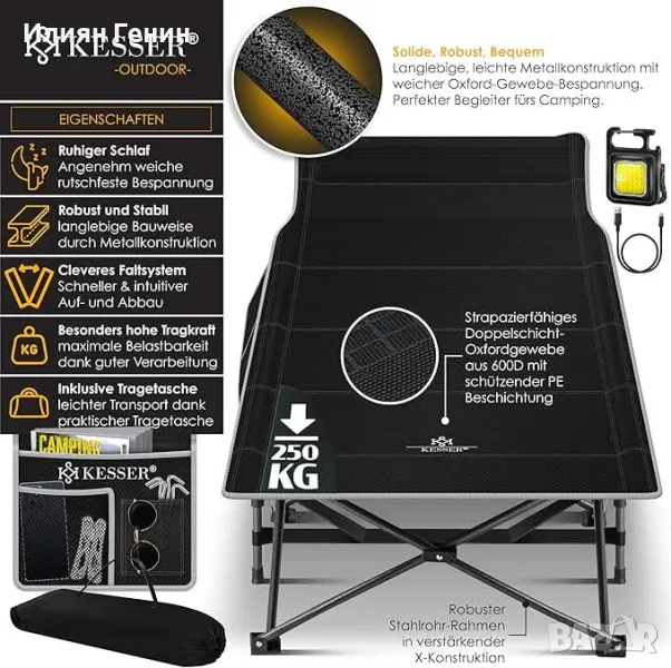 KESSER® Сгъваемо къмпинг легло 190см, къмпинг шезлонг, включително чанта за носене, къмпинг светлина + страничен джоб товароносимост 250 кг - 150.00лв.
