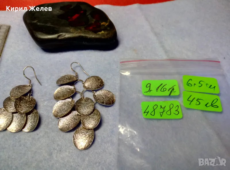 Пускам голяма СЕРИЯ от майсторска ръчна изработка старинни и нови СРЕБЪРНИ БИЖУТА - пръстени, обеци, медальони, гривни, ланци, колиета, брошки - някои са инкрустирани със скъпоценни или полускъпоценни камъни. Всичките са ТЕСТВАНИ ПРОФЕСИОНАЛНО върху лидийски камък с пробер - киселина за сребро, като особено по-старите, ръчно изработени и без маркировка които са, е заснето и резултата на камъка - яркочервеният цвят при натъркване и капване на киселината показва, че са от масивно СРЕБРО ВИСОКА ПРОБА. Има и накити от САЧАН /нископробна сребърна сплав, с която са работели старите майстори - куюмджии от периода на ВЪЗРАЖДАНЕТО и края на 19-ти век/, мед, бронз и благородна стомана с позлата или посребряване. Снимките ги ОНАГЛЕДЯВАТ! Имам НАД 27000 обяви в профила си - За ВСЕКИ по НЕЩО...! Изпращам по Еконт или Спиди с опция Преглед/Тест и отстъпка-транспорт.