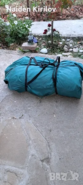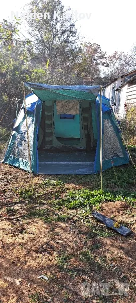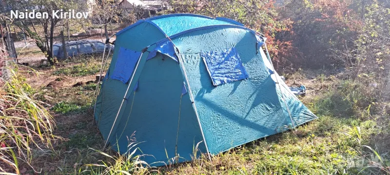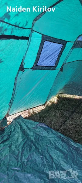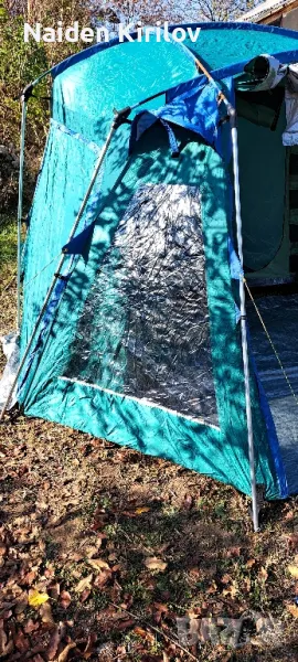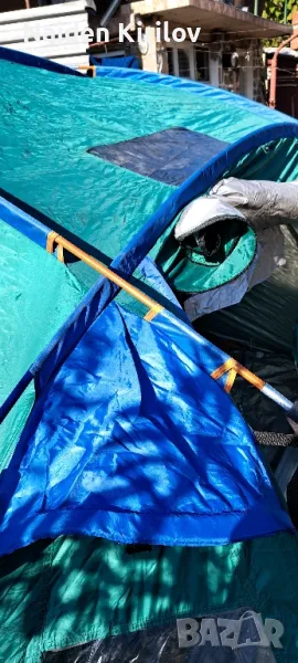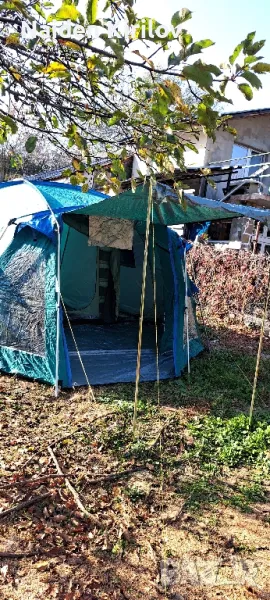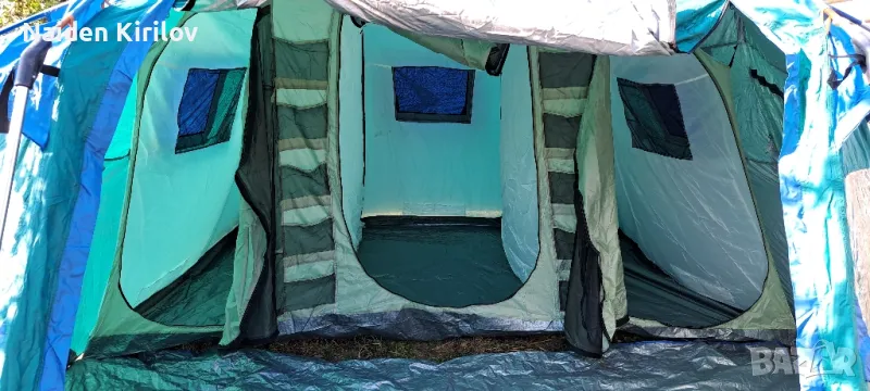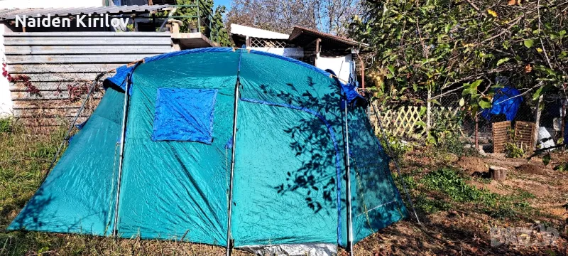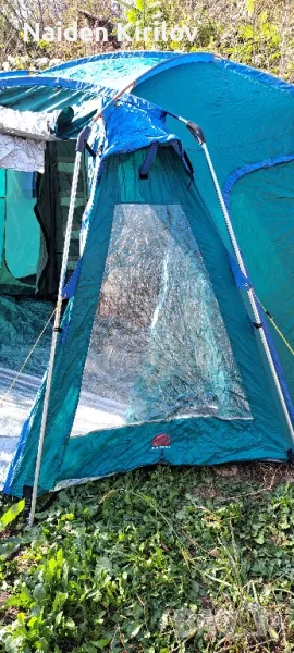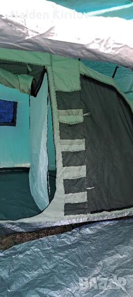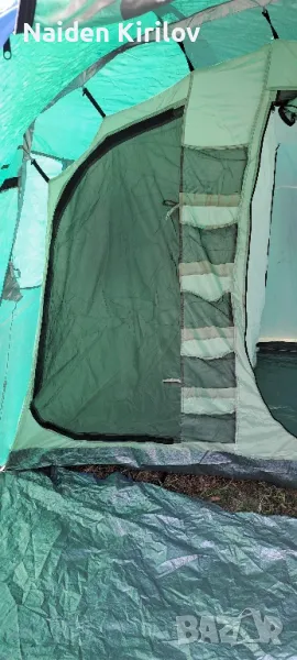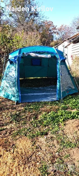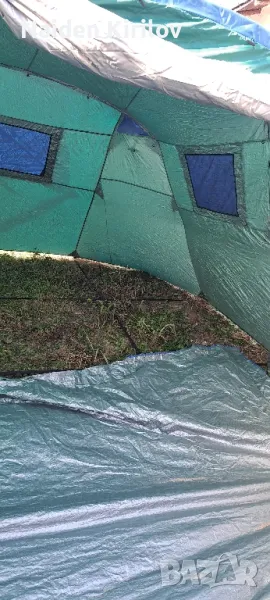 палатка е с три спални, предверие и под. в перфектно състояние, пълен комплект колчета и рейки. спалнята може и да се обедини в една голяма