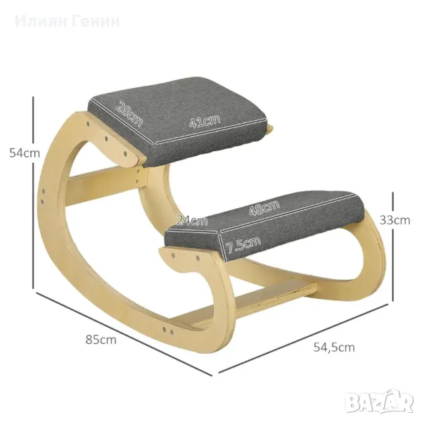 Размери на продукта на коленичния стол: 54,5Ш x 85Д x 54В см, товароносимост: 120 кг, необходим е монтаж. ЗАБЕЛЕЖКА: Тъй като коленичещият стол използва различни мускулни групи, трябва да свиквате с него постепенно и да правите редовни почивки.
