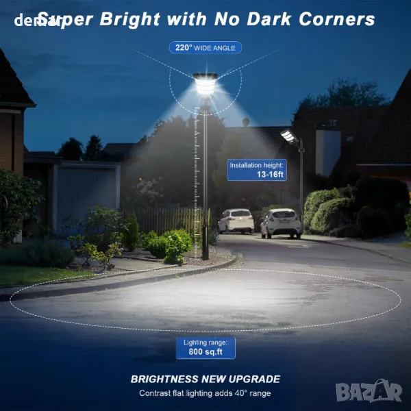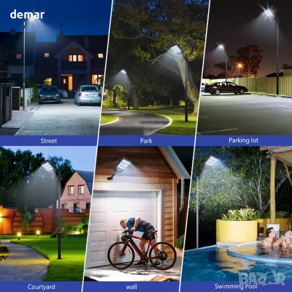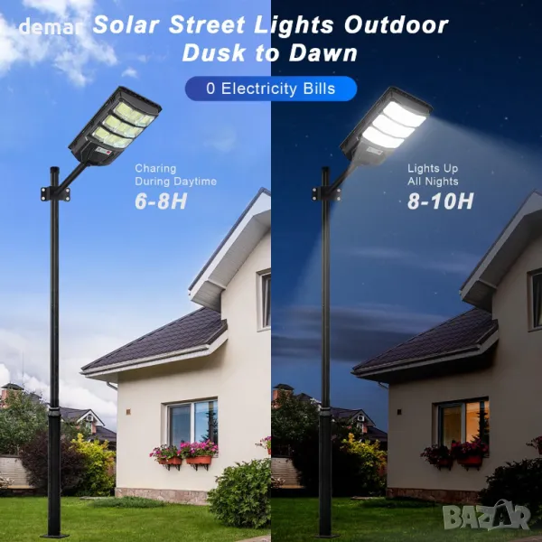 Тази соларна улична лампа е снабдена с ултраярки 216 LED мъниста с широкоъгълен дизайн от 270° за широко осветление. Предлага три режима на осветление – от здрач до зазоряване, сензор за движение и настройки с време – лесно регулируеми чрез дистанционно управление. Инсталацията е лесна, без необходимост от окабеляване, и може да се монтира на стени или стълбове. Захранвана от високоефективен соларен панел и батерия 8000mAh, тя осигурява 10–12 часа светлина след пълно зареждане. Изработена от издръжливи ABS и метални материали, тя е водоустойчива със степен на защита IP66 за надеждна употреба при всякакви метеорологични условия.