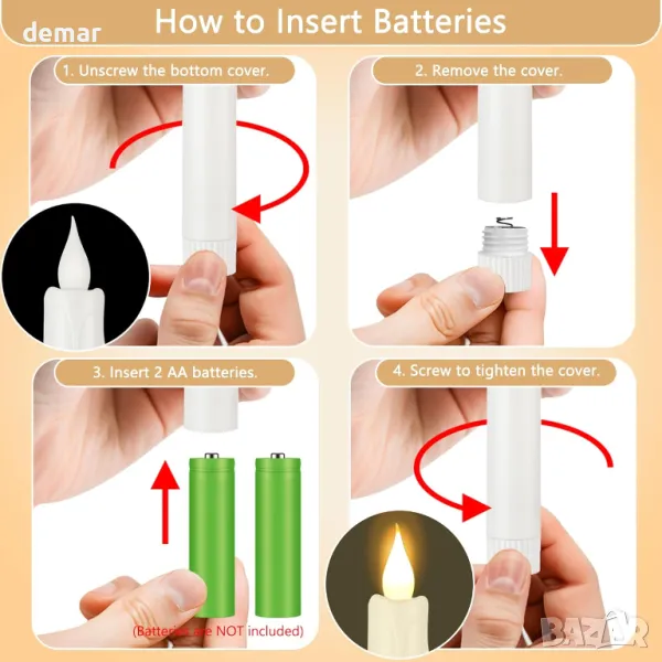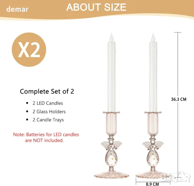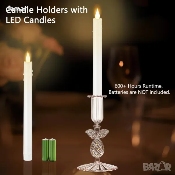 Този комплект включва два ръчно издухани стъклени поставки с форма на ангел и две безпламъчни LED конусовидни свещи с хладен на допир дизайн, без восък или дим. Изработени от издръжливо високо боросиликатно стъкло, те предлагат леко, но устойчиво на счупване покритие с викториански чар. Всяка свещ разполага със скрит превключвател за включване/изключване и опростено отделение за батерии за лесна настройка, като работи над 600 часа с батерии тип AA (не са включени). Идеални за сватби, празници или ежедневен декор, те предоставят елегантна алтернатива на традиционните свещи за многократна употреба.