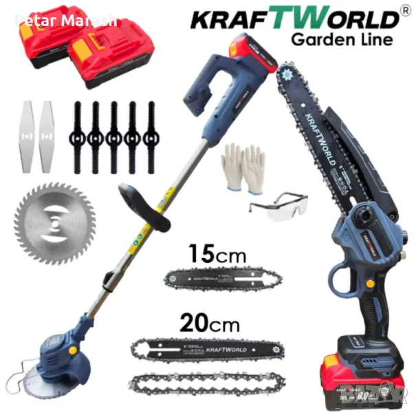 Акумулаторен Тример за Трева KraftWorld + Резачка за Клони с Авто-Омасляване