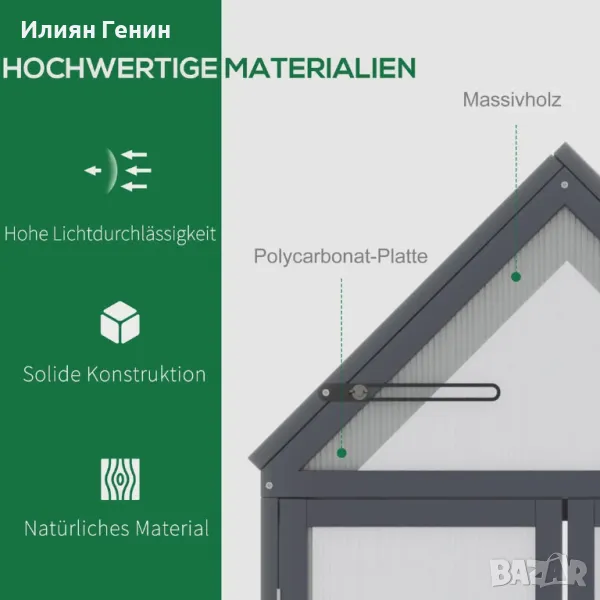 Дървена рамка: Рамката на оранжерията е изработена от здрава дървесина и има устойчиво на атмосферни влияния покритие, което прави оранжерията идеална за постоянна употреба на открито.