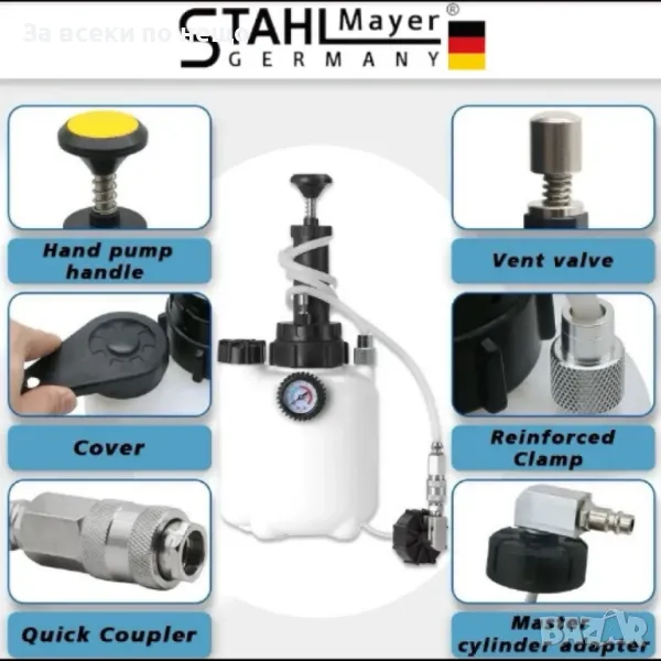 Комплект вакуум помпа за обезвъздушаване на спирачки StahlMayer е с работно налягане от 0.7 до 2 бара. Служи както за обезвъздушаване, така и за източване на спирачната течност. Има капацитет на резервоара 3 литра и се доставя с допълнителна бутилка с вместимост 1 литър. Намира приложение за проверка херметичността на различните системи на автомобила. Снабдена е с манометър, позволяващ лесно следене на стойностите на вакуума и налягането.