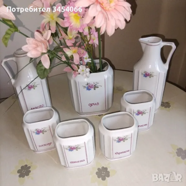 Порцеланови буркани за подправки. Идеални за декорация на битови стаи и механи. Може да се закупят отделни бройки. Каничките за оцет и масло- продадени.