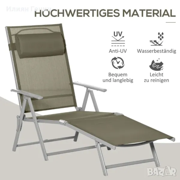 Универсален: Шезлонгът е устойчив на атмосферни влияния и затова е идеален за употреба на открито, например в градината, на балкона или при къмпинг.