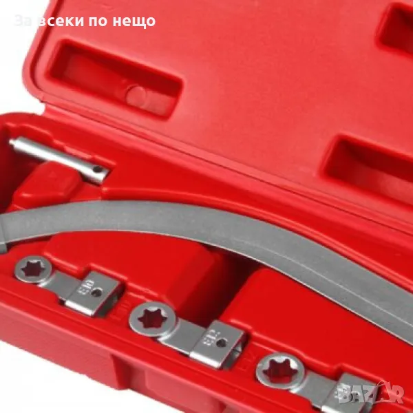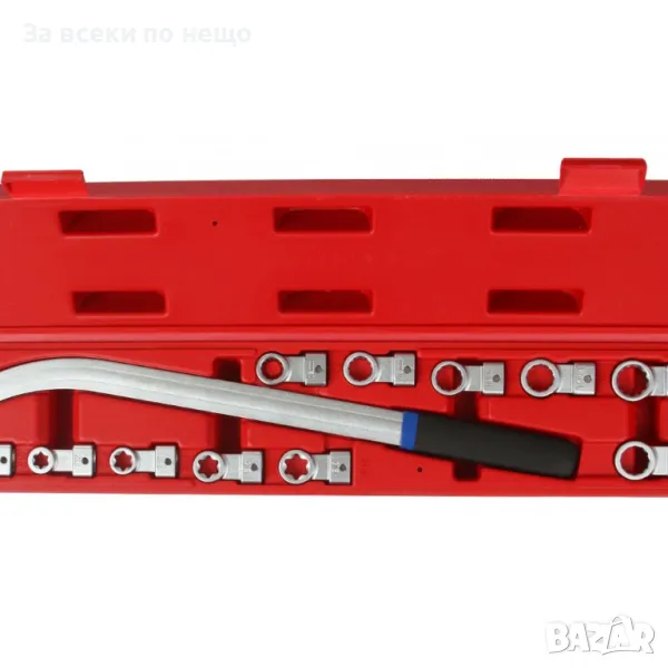 Ключ за разглобяване на обтегачите със сменяеми накрайници и огъната дръжка. Комплектът включва 13 броя TORX и пръстеновидни клеми в популярни размери.