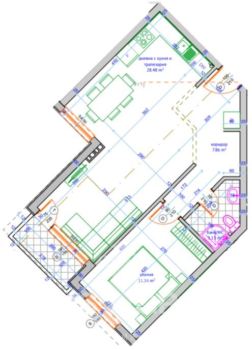 -Дневен тракт с кухненска част с площ близо 30 кв.м