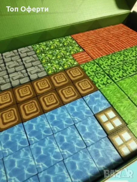 100 броя магнитни кубчета с различни текстури (дърво, тухла, листа, камък, вода);
