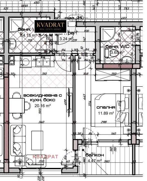Имотът е расположен на пети жилищен етаж с площ 63.41 кв.м. и се състои от коридор, баня с тоалетна, дневен тракт с кухненски бокс, една спалня, тераса.