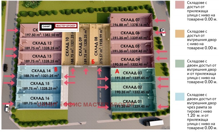 В момента базата е разделена на складове от по 200кв.м. и от по 400кв.м. Възможност за обединяване и разделяне на складовете според желанието на купувача. Всеки склад разполага с ТИР достъп и рампа за зареждане.
