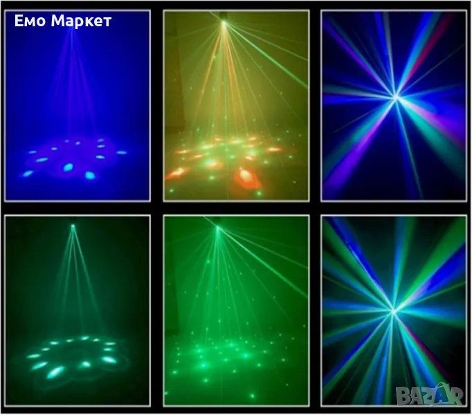 Източник на светлина: 6 x 12W LED лампови модула (RGBW – червено, зелено, синьо, бяло, 4-в-1), 1 x 150mW зелена лазерна светлина;