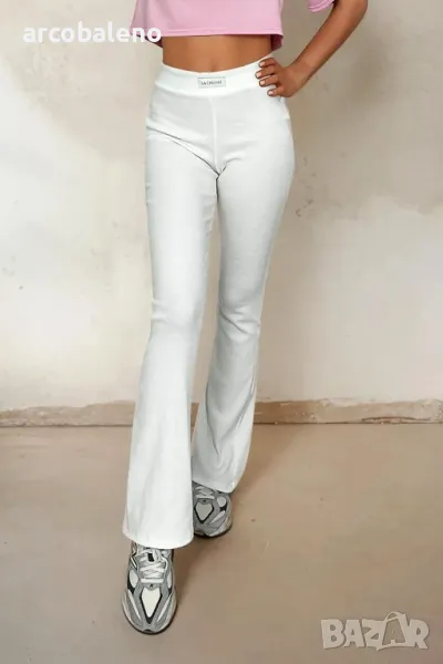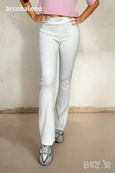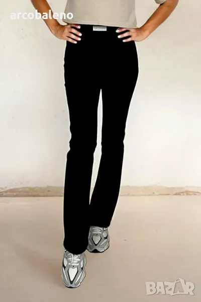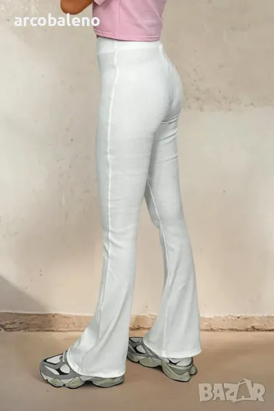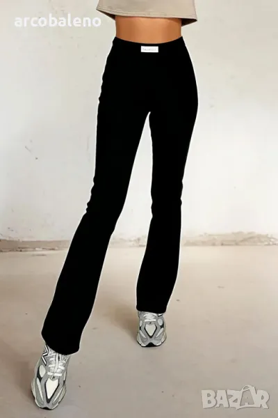 Оребрен панталон с широки крачоли в стил камбан. Златна нашивка като фин детайл. Модел, който оптически удължава краката и добавя стил към всеки стайлинг.
