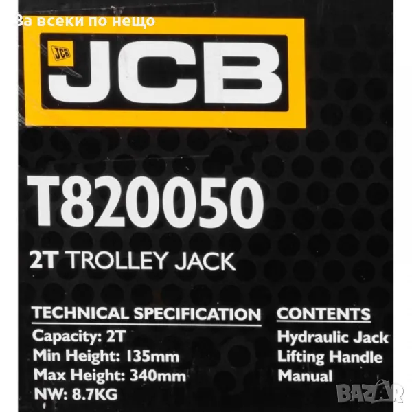 Крик крокодил JCB с товароподемност 2 тона с минимална височина 135 мм и максимална височина 340 мм.