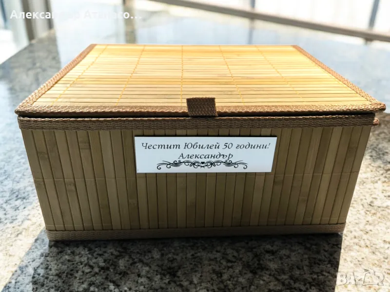 Кутията е от бамбук с размери – 32см. Х 25см. + Декоративна слама от вътрешната страна и табелка, на която можем да гравираме пожелание по ваш избор !