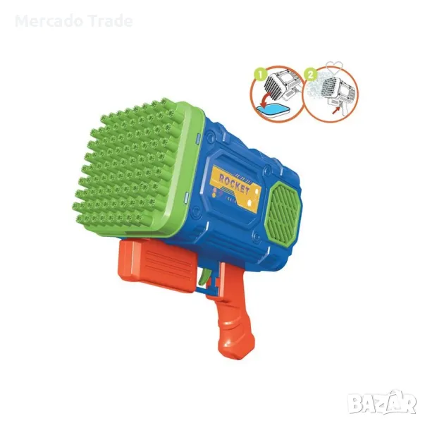 Базука за саунени балони Mercado Trade, която изстрелва стотици сапунени мехурчета от устройството с 87 дупки, заедно със 100 мл течност за сапунени мехурчета.