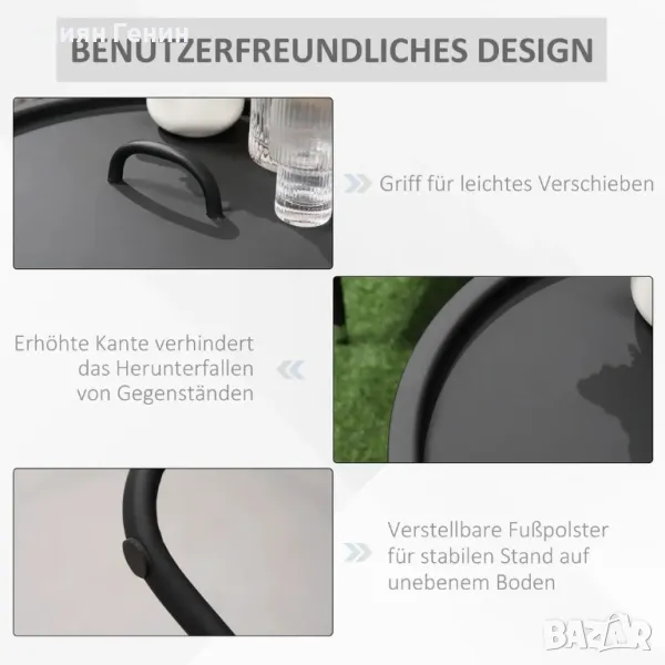 УДОБСТВО ЗА ПОТРЕБИТЕЛЯ: Плотът на тази кръгла градинска маса има дръжка, която ви позволява да я местите удобно. Освен това, повдигнатият ръб на масата предотвратява падането на неща. Поставките за крака могат лесно да се регулират, за да осигурят стабилност дори на неравен терен.