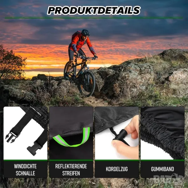 Интелигентен дизайн на ветроустойчивите катарами: катарама в горната част, катарама в задната част, 3 катарами и шнур в долната част, както и 2 гумени ленти отпред и отзад гарантират, че покривалото за кола е здраво прикрепено към велосипеда. Когато приключите с колоезденето, просто завържете плътно всички катарами и ластици на покривалото за кола, за да осигурите безопасност при паркиране на велосипеда.