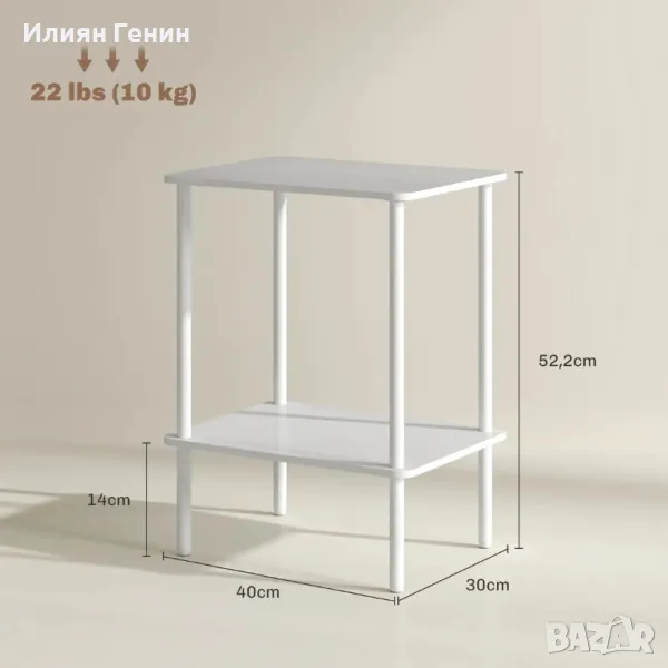 Размери на масичката за диван: 40Д x 30Ш x 52.2В см. Товароносимост: общо 10 кг, 5 кг на рафт. Необходимо е сглобяване