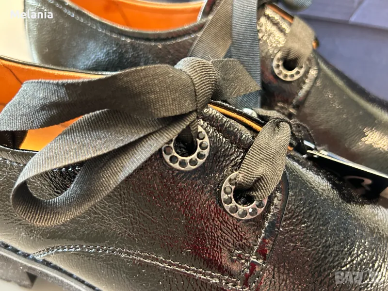 Естествена кожа (лак) отвън и отвътре. Подвижна стелка, декорация- черни мъниста около връзката.
