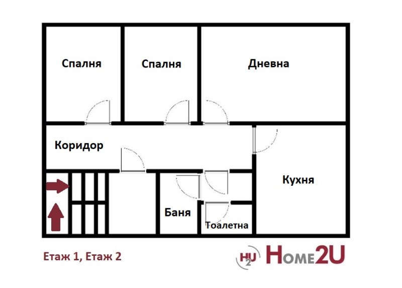 Имота има следното разпределение: Партерен етаж: две стаи (изби), два гаража. Първи етаж: хол, кухня, две спални, баня, тоалетна, две тераси. Втори етаж: хол, кухня, две спални, баня, тоалетна две тераси.