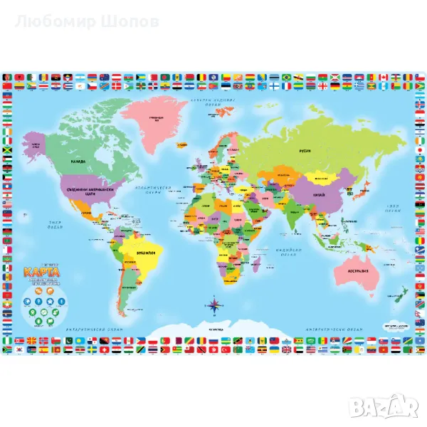 Образователна игра за цялото семейство! 1500 факта и въпроса за държавите по света! Играй и учи! Интерактивната карта е на два езика - български и английски. Можеш да я окачиш на стената или да я разположиш на масата. Докосни картата и тя ще ти даде информация за съответната държава. 150 държави с интерактивни точки, които дават информация за: