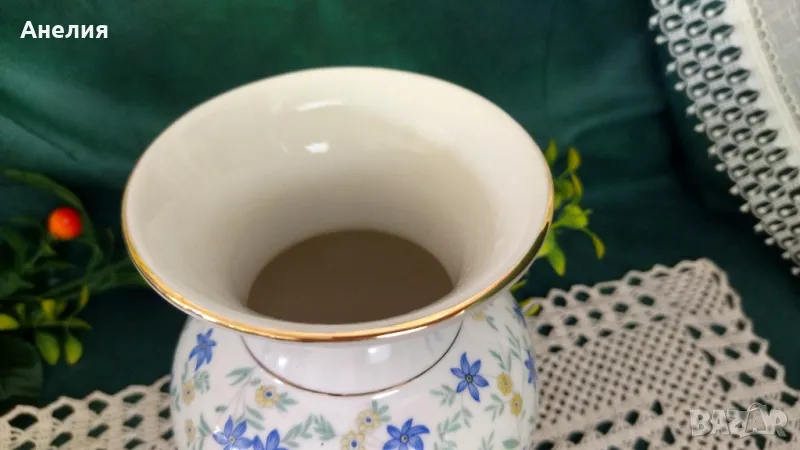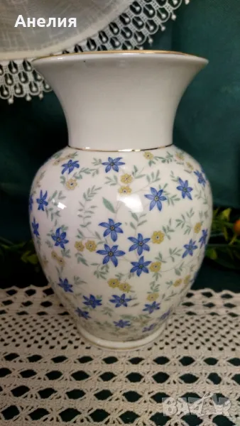 Ваза с цвят екрю и сини цветлета.