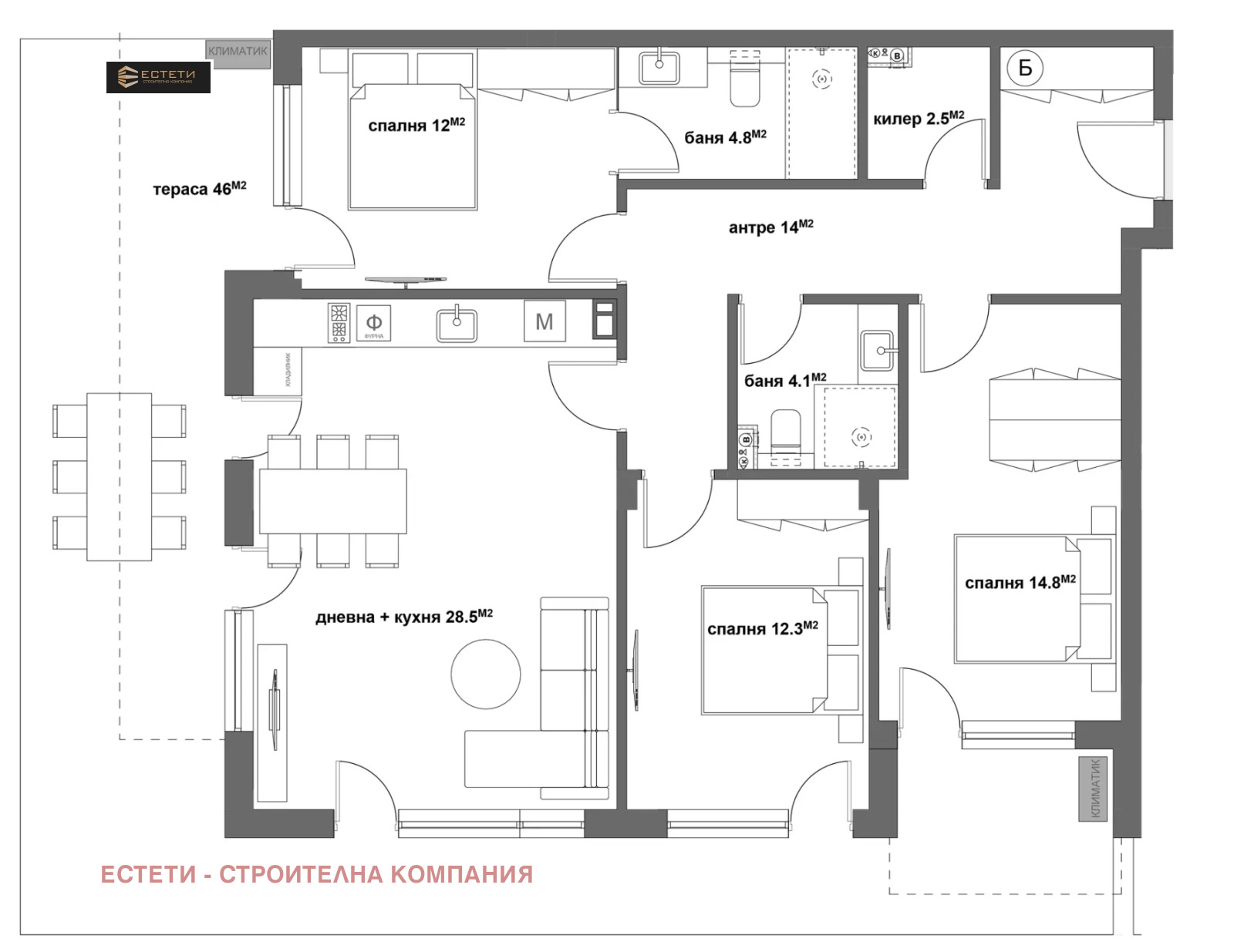 🏡 Триспален апартамент състоящ се от - антре, дневна с кухня, три спални, две бани с тоалетна, килер и две тераси. Квадратура - 192 кв.м.