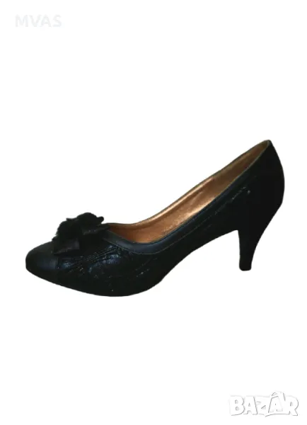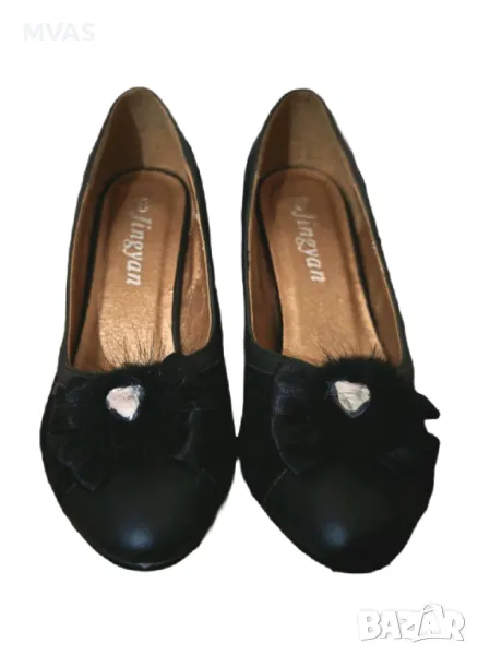 Нови дамски черни официални обувки на малко токче. Декорирани с панделка и пухчета отпред, отстрани има кант от плат.