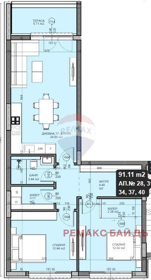 Апартаментът е с площ от 103,33 кв.м и се състои от просторна дневна с кухненска зона, уютна спалня, детска спалня, баня с тоалетна, тераса с впечатляваща гледка към морето и килер.