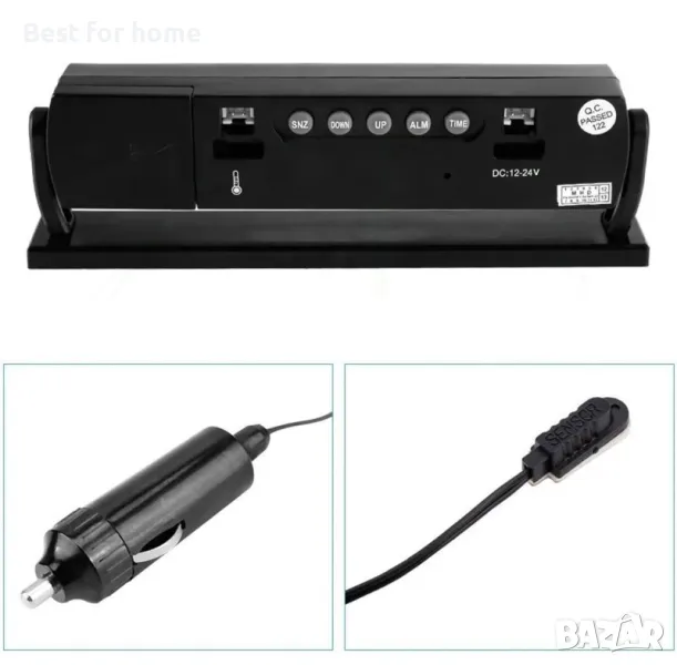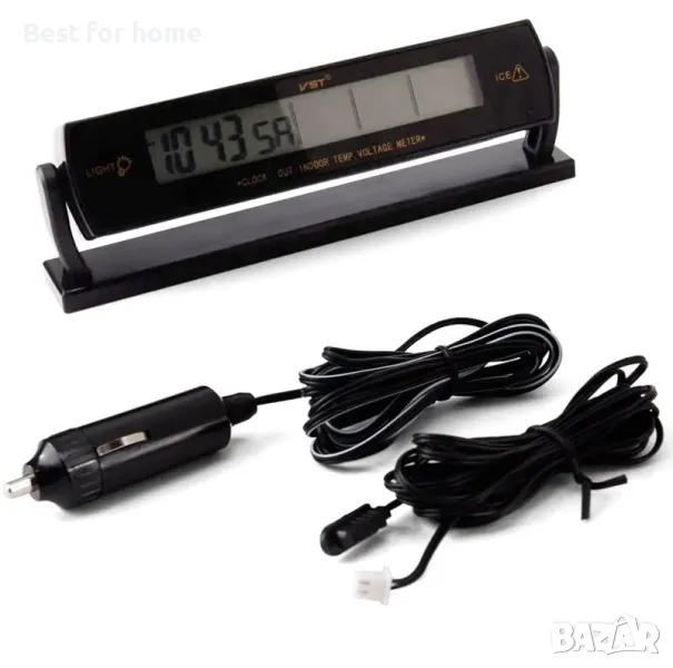 термометър за кола с часовник и измерване на заряда на батерията. Термометърът разполага с голям, ясен LCD дисплей с подсветка (захранван от 12V гнездо за запалка на автомобил), който показва едновременно температурата от два сензора, часа и напрежението на батерията. Дълъг кабел с водоустойчив сензор за външна температура позволява сензорът да бъде поставен точно под предната броня, което гарантира най-доброто измерване на външната температура по време на шофиране и стоене. Възможност за промяна на формата на дисплея на часа (12 или 24) и мерната единица за температура (C / F). Комплектът включва здрава, двойнозалепваща лента за лесно закрепване на термометъра към тапицерията на автомобила.