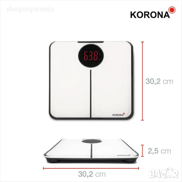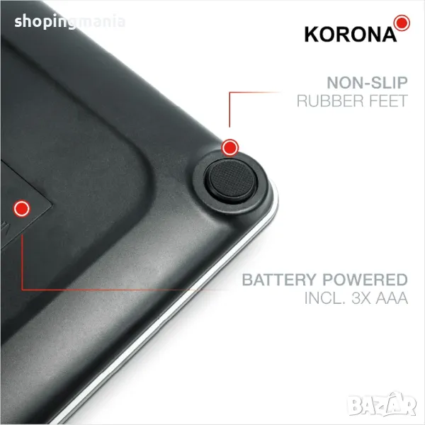 СИГУРНА СТОЙКА - С размери 30,2 x 30,2 см и височина в плоско състояние от само около 2,5 см, тази везна има особено сигурна стойка и може да се съхранява по начин, пестящ място.