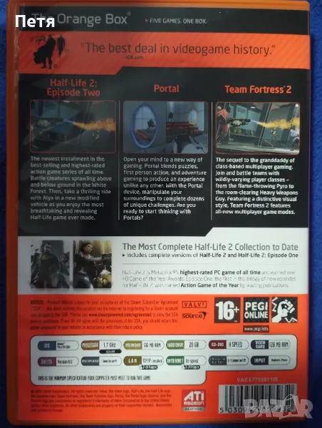 Продавам игра за компютър Half-Life 2: The Orange Box. В отлично състояние. Продава се както е на снимките.Легендарната Оранжева кутия е масивен пакет, събрал на едно място всички Half-Life 2 игри до момента, включително продълженията Half-Life 2: Episode One, Episode Two, самостоятелната главоблъсканица Portal и отборния екшън от първо лице Team Fortress 2. Потопете се в света на една от най-успешните игри до момента, продължавайки приключенията на безсмъртния Гордън Фрийман.Изберете своя герой и се впуснете в шантави отборни битки, каквито може да предложи единствено Team Fortress 2. А когато приключите с всичко това, опитайте Portal – революционната логическа главоблъсканица с едва забележими елементи на екшън, в която целта ви е да стигнете от една точка до друга. Вместо стандартно оръжие, в Portal получавате модифициран вариант на класическия Gravity Gun от Half-Life 2, който вече е способен да отваря портали, способни да пренасят не само обекти, а и хора.Минимални Системни Изисквания:CPU Speed: 1.7 GHzRAM: 512 MBOS: Windows 2000/XP/Vista/7Video Card: DirectX 8.1 level Graphics CardSound Card: YesFree Disk Space: 5 GB