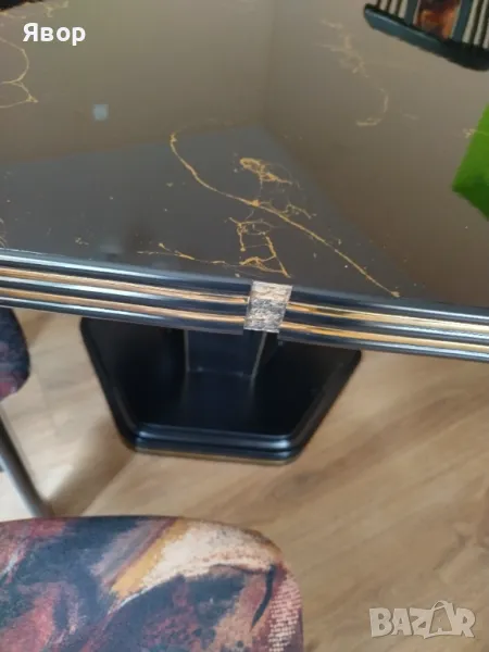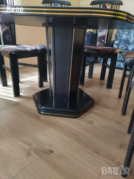 Продавам трапезна шестоъгълна маса. Дебелина на плота 4 см. Размери 120/110 см. вис. 75 см Масата е черна, със среден крак и доста масивна. Плота се сваля за транспорт. Съвсем лек дефект виден от снимките отразен в цената. Продава се поради смяна на интериора. Може и к-т със 6 бр. столове.