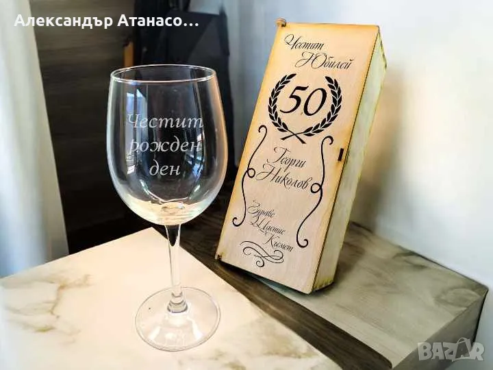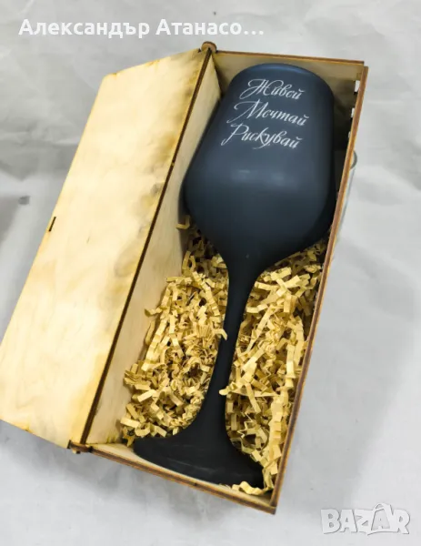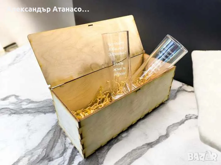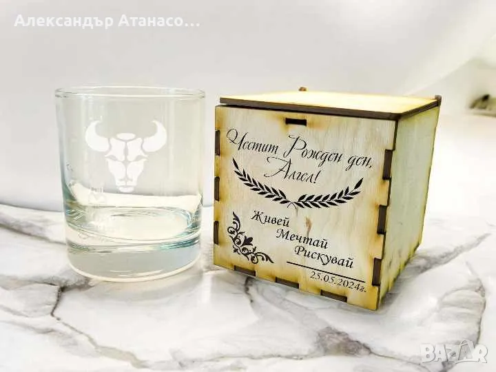 Лазерно гравирани стъклени чаши с дървена кутия ( различни модели )