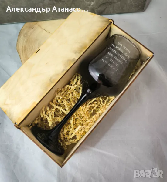 Стъклена чаша за вино с дървена подаръчна кутия + декоративна слама от вътрешната страна.