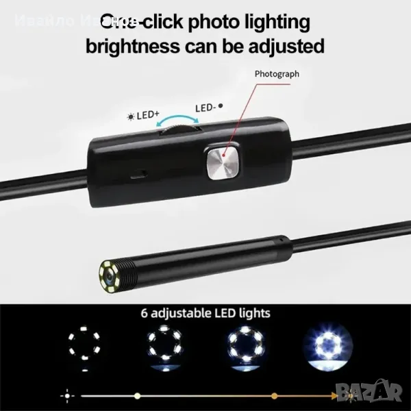 Ендоскопска камера, лед светлина с потенциометър, водоустойчива, твърд кабел 2м. - 30лв