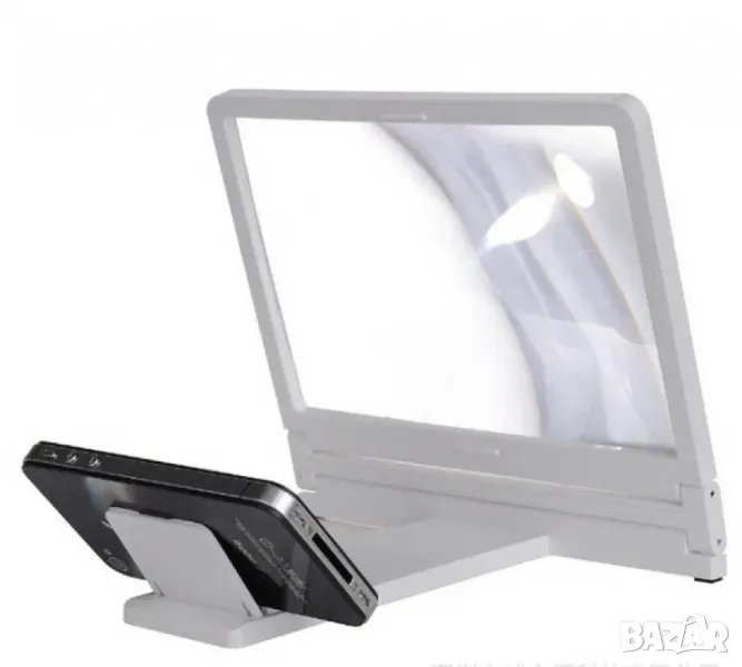 Увеличителен екран за телефон 3D/ Елегантната, семпла и олекотена приставка представлява поставка за телефон с лупа, която ще промени тотално ефекта на картината./ Трикратно увеличение на екрана; Възможност за промяна ъгъла на увеличителната стойка; Материал: пластмаса; Размери: 165 x 100 x 15 мм; Съвместим за всякакви видове телефони;
