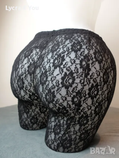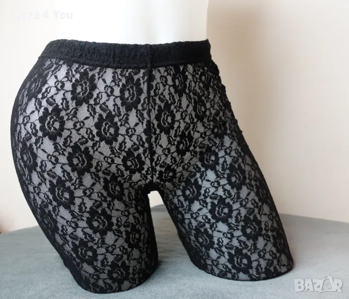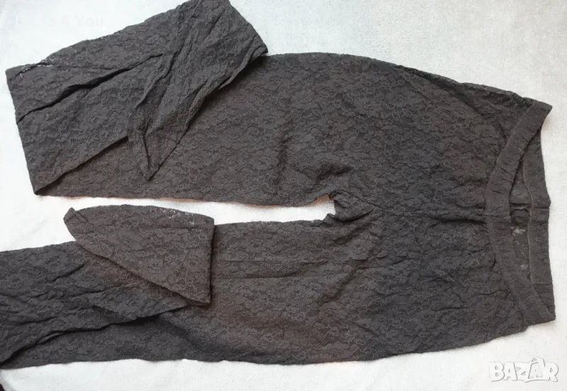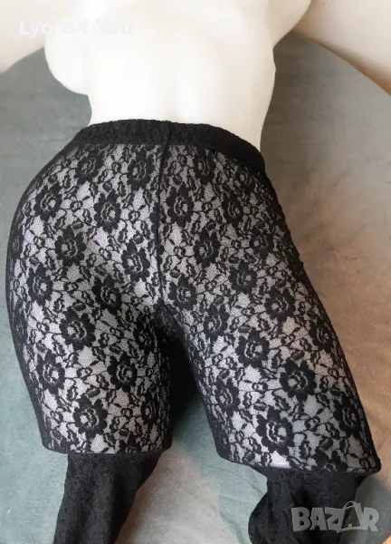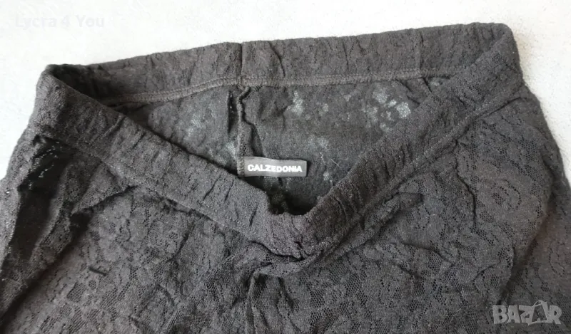 Черен дантелен чорапогащник (тюл и дантела на цветя) с затворени пръсти и черен ръб отзад по краката. Марката е Calzedonia за тези, които са запознати с нея.